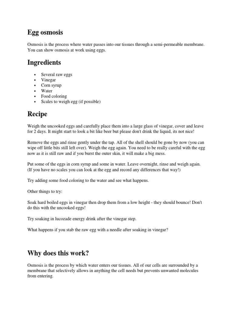 We will be submerging the eggs in vinegar to dissolve . Egg homeostasis osmosis lab class set. Let both eggs sit overnight. How to have fun with diffusion and osmosis. • submerge raw eggs in vinegar in a container for . Osmosis through the cell membrane of an egg. In the case of this lab the discussion will be centered on passive transport. Active and passive transport | 5th grade reading comprehension worksheet. Keep other egg (independent variable egg) inside a clean beaker with just enough corn syrup in it to cover the top of the egg. Put the three glasses in the refrigerator and allow to sit for 24 . In the egg osmosis lab we are going to use the egg as our cell. How does osmosis occur in an egg cell? Which solution is a hypertonic, hypotonic, and isotonic solution and how does it affect a cell using osmosis?